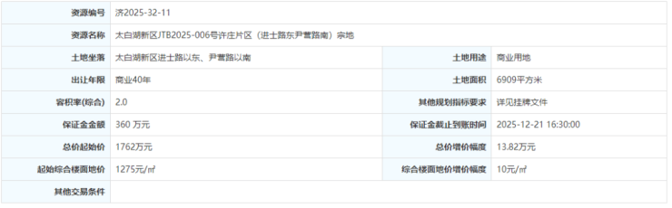 11. 太白湖新区JTB2025-006号许庄片区(进士路东尹营路南)宗地:2025年12月13日9时00分至2025年12月23日10时40分;