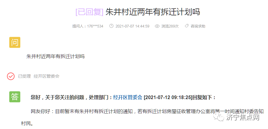 任城区政府回复:安居街道暂未收到有关西李村的拆迁计划。