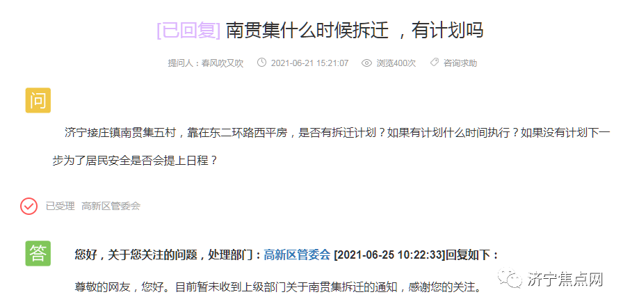 高新区管委会回复:目前暂未收到上级部门关于南贯集拆迁的通知。
