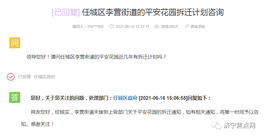 任城区政府回复:经核实,李营街道未接到上级部门关于平安花园的拆迁通知,如有相关通知,将排名前列时间予以告知。