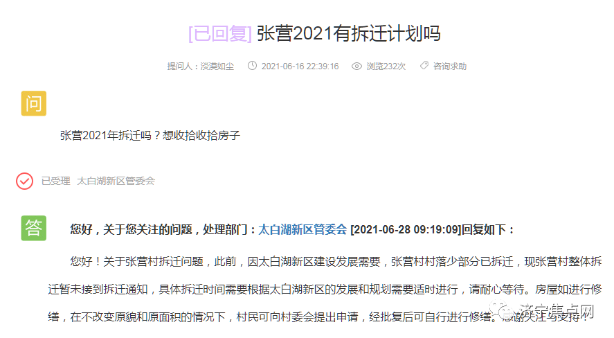 太白湖新区管委会回复:现张营村整体拆迁暂未接到拆迁通知,具体拆迁时间需要根据太白湖新区的发展和规划需要适时进行,请耐心等待。