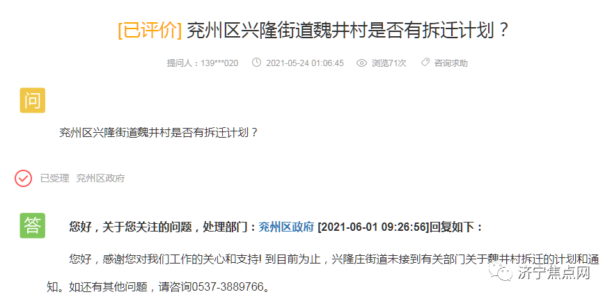 兖州区政府回复:到目前为止,兴隆庄街道未接到有关部门关于魏井村拆迁的计划和通知。