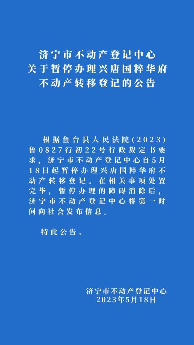 根据鱼台县人民法院(2023)鲁0827行初22号行政裁定书要求,济宁市不动产登记中心自5月18日起暂停办理兴唐国翠华府不动产转移登记。在相关事项处置完毕,暂停办理的障碍消除后,济宁市不动产登记中心将第一时间向社会发布信息。