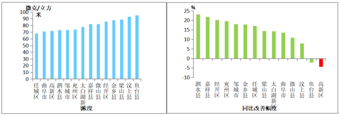 细颗粒物(PM2.5)浓度较低的县(市、区)是邹城市,为40微克/立方米;较高的是金乡县,为51微克/立方米;14县(市、区)同比改善幅度较大的是微山县,改善幅度为16.0%,最小的是太白湖新区,改善幅度为-22.5%。