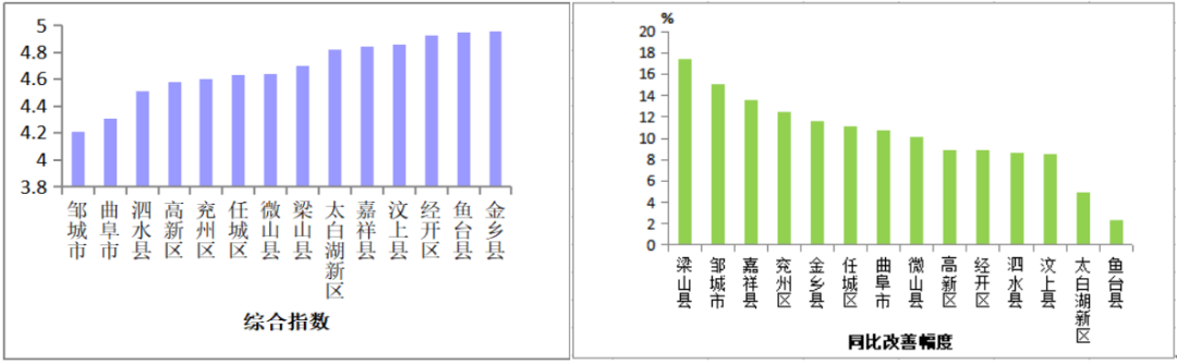 环境空气质量综合指数较好的县(市、区)是邹城市,为4.21;最差的是金乡县,为4.96;14县(市、区)同比改善幅度较大的是梁山县,改善幅度为17.4%,最小的是鱼台县,改善幅度为2.4%。
