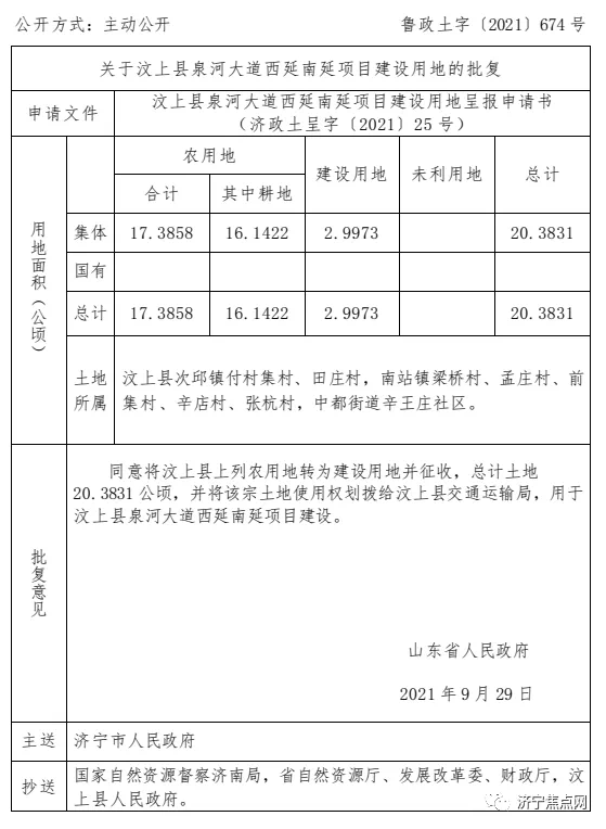 土地所属:汶上县次丘镇付村集村、田庄村,南站镇梁桥村、孟庄村、前集村、辛店村、张杭村,中都街道辛王庄社区。批复意见:同意将汶上县上列农用地转为建设用地并征收,总计土地20.3831公顷,并将该宗土地使用权划拨给汶上县交通运输局,用于汶上县泉河大道西延南延项目建设。