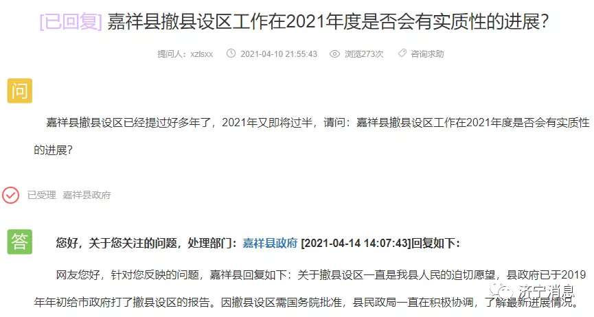 近日,有网友在山东省济宁市网络问政平台上咨询:该市的嘉祥县撤县设区工作今年是否会有实质性进展?
