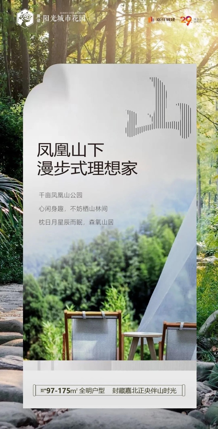 凤凰山下,漫步式理想家。千亩凤凰山公园,心闲身趣,不妨栖山林间。枕日月星辰而眠,森氧山居。阳光城市花园建面约97-175㎡全明户型,封藏嘉北正央伴山时光。