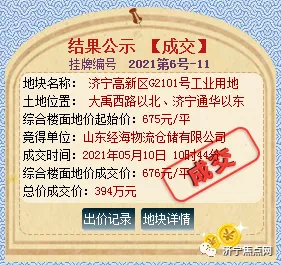地块十一:济宁高新区G2101号工业用地【山东经海物流仓储有限公司拍得】土地位于:大禹西路以北、济宁通华以东;土地面积:7284㎡(约11亩);土地用途:工业用地;出让年限:50年;容积率不小于0.8;起始价:394万元,综合楼面价起价:675元/㎡;交付条件为净地(执行标椎化供应);最终成交价为:394万元(约36万元/亩),综合楼面地价成交价:675元/㎡;溢价率:0.0%;