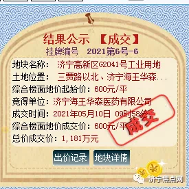 地块六:济宁高新区G2041号工业用地【济宁海王华森医药有限公司拍得】土地位于:三贾路以北、济宁海王华森医药有限公司以西;土地面积:21853㎡(约33亩);土地用途:工业用地;出让年限:50年;容积率不小于0.9;起始价:1181万元,综合楼面价起价:600元/㎡;交付条件为净地(执行标椎化供应);最终成交价为:1181万元(约36万元/亩),综合楼面地价成交价:600元/㎡;溢价率:0.0%;