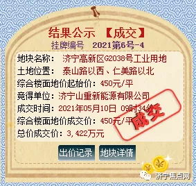 地块四:济宁高新区G2038号工业用地【济宁山重新能源有限公司拍得】土地位于:泰山路以西、仁美路以北;土地面积:63370㎡(约95亩);土地用途:工业用地;出让年限:50年;容积率不小于1.2;起始价:3422万元,综合楼面价起价:450元/㎡;交付条件为净地(执行标椎化供应);最终成交价为:3422万元(约36万元/亩),综合楼面地价成交价:450元/㎡;溢价率:0.0%;