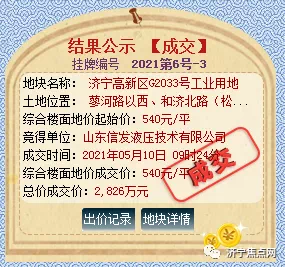 地块三:济宁高新区G2033号工业用地【山东信发液压技术有限公司拍得】土地位于:蓼河路以西、和济北路(松花江路)以东;土地面积:52325㎡(约78亩);土地用途:工业用地;出让年限:50年;容积率不小于1.0;起始价:2826万元,综合楼面价起价:540元/㎡;交付条件为净地(执行标椎化供应);最终成交价为:2826万元(约36万元/亩),综合楼面地价成交价:540元/㎡;溢价率:0.0%;