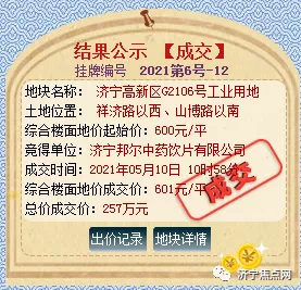 地块十二:济宁高新区G2106号工业用地【济宁邦尔中药饮片有限公司拍得】土地位于:祥济路以西、山博路以南;土地面积:4752㎡(约7亩);土地用途:工业用地;出让年限:50年;容积率不小于0.9;起始价:257万元,综合楼面价起价:600元/㎡;交付条件为净地(执行标椎化供应);最终成交价为:257万元(约37万元/亩),综合楼面地价成交价:600元/㎡;溢价率:0.0%;