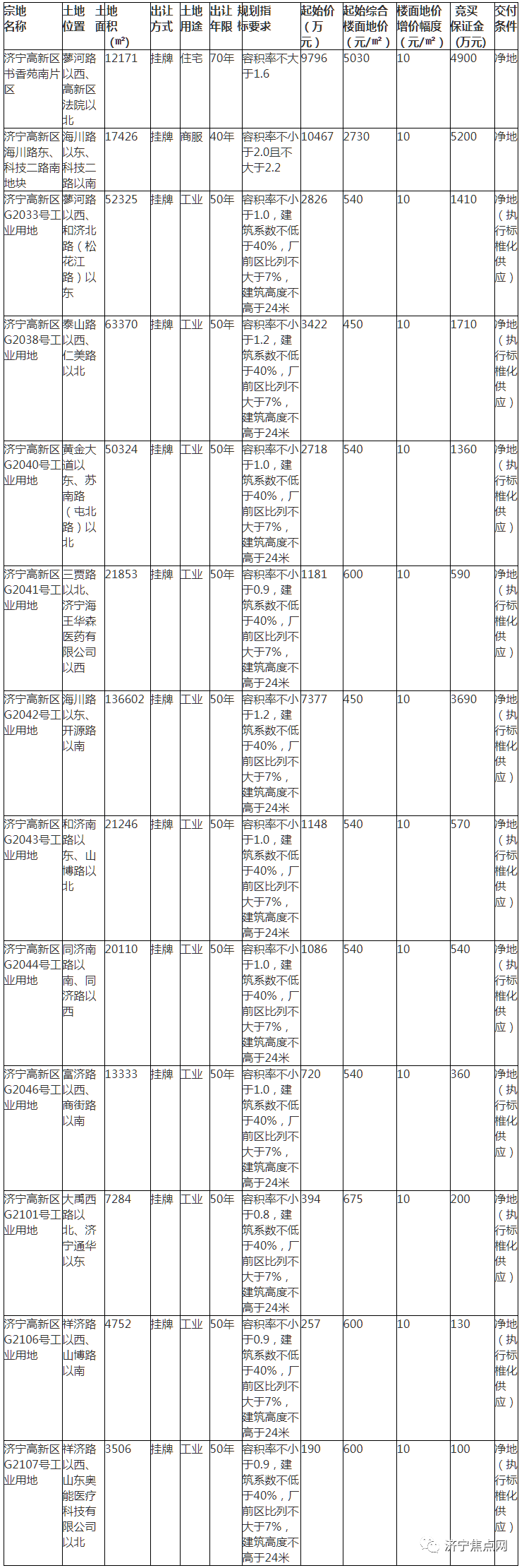 济宁高新区批量挂地!搜狐新闻·搜狐焦点济宁小编从济宁市自然资源和规划局了解到:经济宁市人民政府批准,济宁市自然资源和规划局决定以公开方式出让高新区13宗国有建设用地使用权,土地用途为1宗住宅用地、1宗商住用地、11宗工业用地;土地总面积424302㎡,约636亩;土地起始价为41582万元;经竞价后,地块全部成交,成交价为44853万元。