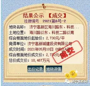 地块二:济宁高新区海川路东、科技二路南地块【济宁高新城建投资有限公司拍得】土地位于:海川路以东、科技二路以南;土地面积:17426㎡(约26亩);土地用途:商服用地;出让年限:40年;容积率不小于2.0且不大于2.2;起始价:10467万元,综合楼面价起价:2730元/㎡;交付条件为净地;最终成交价为:10467万元(约402万元/亩),综合楼面地价成交价:2730元/㎡;溢价率:0.0%;