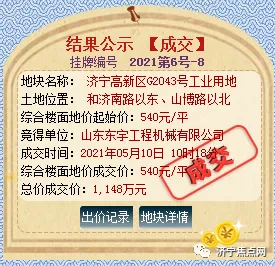 地块八:济宁高新区G2043号工业用地【山东东宇工程机械有限公司拍得】土地位于:和济南路以东、山博路以北;土地面积:21246㎡(约32亩);土地用途:工业用地;出让年限:50年;容积率不小于1.0;起始价:1148万元,综合楼面价起价:540元/㎡;交付条件为净地(执行标椎化供应);最终成交价为:1148万元(约36万元/亩),综合楼面地价成交价:540元/㎡;溢价率:0.0%;