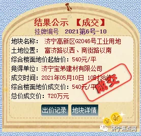 地块十:济宁高新区G2046号工业用地【济宁宝弟建材有限公司拍得】土地位于:富济路以西、商街路以南;土地面积:13333㎡(约20亩);土地用途:工业用地;出让年限:50年;容积率不小于1.0;起始价:720万元,综合楼面价起价:540元/㎡;交付条件为净地(执行标椎化供应);最终成交价为:720万元(约36万元/亩),综合楼面地价成交价:540元/㎡;溢价率:0.0%;