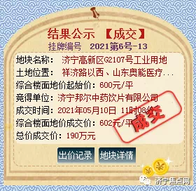 地块十三:济宁高新区G2107号工业用地【济宁邦尔中药饮片有限公司拍得】土地位于:祥济路以西、山东奥能医疗科技有限公司以北;土地面积:3506㎡(约5亩);土地用途:工业用地;出让年限:50年;容积率不小于0.9;起始价:190万元,综合楼面价起价:600元/㎡;交付条件为净地(执行标椎化供应);最终成交价为:190万元(约38万元/亩),综合楼面地价成交价:600元/㎡;溢价率:0.0%;