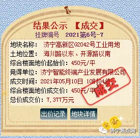 地块七:济宁高新区G2042号工业用地【济宁智能终端产业发展有限公司拍得】土地位于:海川路以东、开源路以南;土地面积:136602㎡(约205亩);土地用途:工业用地;出让年限:50年;容积率不小于1.2;起始价:7377万元,综合楼面价起价:450元/㎡;交付条件为净地(执行标椎化供应);最终成交价为:7377万元(约36万元/亩),综合楼面地价成交价:450元/㎡;溢价率:0.0%;