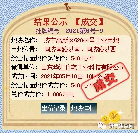 地块九:济宁高新区G2044号工业用地【山东华汇住宅工业科技有限公司拍得】土地位于:同济南路以南、同济路以西;土地面积:20110㎡(约30亩);土地用途:工业用地;出让年限:50年;容积率不小于1.0;起始价:1086万元,综合楼面价起价:540元/㎡;交付条件为净地(执行标椎化供应);最终成交价为:1086万元(约36万元/亩),综合楼面地价成交价:540元/㎡;溢价率:0.0%;