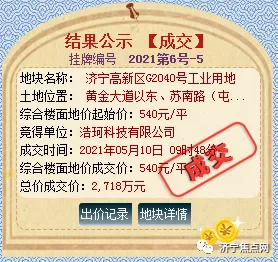 地块五:济宁高新区G2040号工业用地【浩珂科技有限公司拍得】土地位于:黄金大道以东、苏南路(屯北路)以北;土地面积:50324㎡(约75亩);土地用途:工业用地;出让年限:50年;容积率不小于1.0;起始价:2718万元,综合楼面价起价:540元/㎡;交付条件为净地(执行标椎化供应);最终成交价为:2718万元(约36万元/亩),综合楼面地价成交价:540元/㎡;溢价率:0.0%;
