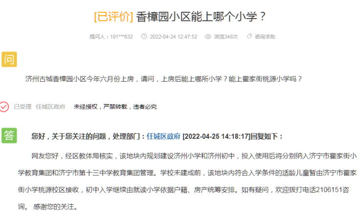 近日,搜狐网济宁小编在济宁市网络问政平台上注意到有网友提问: 济州古城香樟园小区今年六月份上房,请问,上房后能上哪所小学?能上霍家街桃源小学吗?