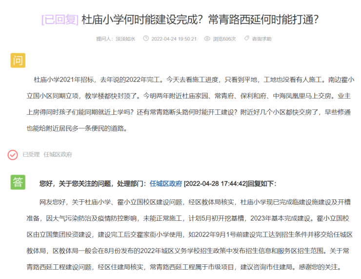 对此,任城区政府回复如下:关于杜庙小学、霍小立国校区建设问题,经区教体局核实,杜庙小学现已完成临建设施建设及开槽准备,因大气污染防治及疫情防控影响,未能正常施工,计划5月初开挖基槽,2023年基本完成建设。霍小立国校区由立国集团投资建设,建设完工后交霍家街小学使用,如2022年9月1号前建设完工达到招生条件并移交给任城区教体局,区教体局一般会在8月份发布的2022年城区义务学校招生政策中发布招生信息和服务区招生范围。关于常青路西延工程建设问题,经区住建局核实,常青路西延工程属于市级项目,建议咨询市住建局。