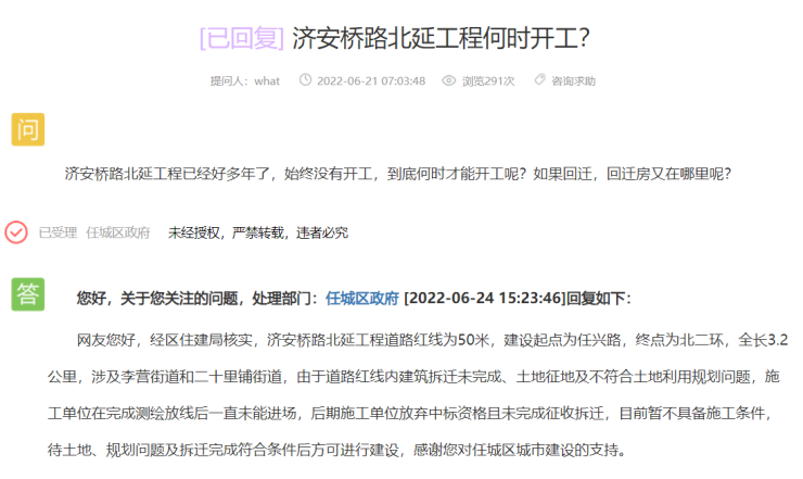 对此,任城区政府回复如下:经区住建局核实,济安桥路北延工程道路红线为50米,建设起点为任兴路,终点为北二环,全长3.2公里,涉及李营街道和二十里铺街道,由于道路红线内建筑拆迁未完成、土地征地及不符合土地利用规划问题,施工单位在完成测绘放线后一直未能进场,后期施工单位放弃中标资格且未完成征收拆迁,目前暂不具备施工条件,待土地、规划问题及拆迁完成符合条件后方可进行建设、
