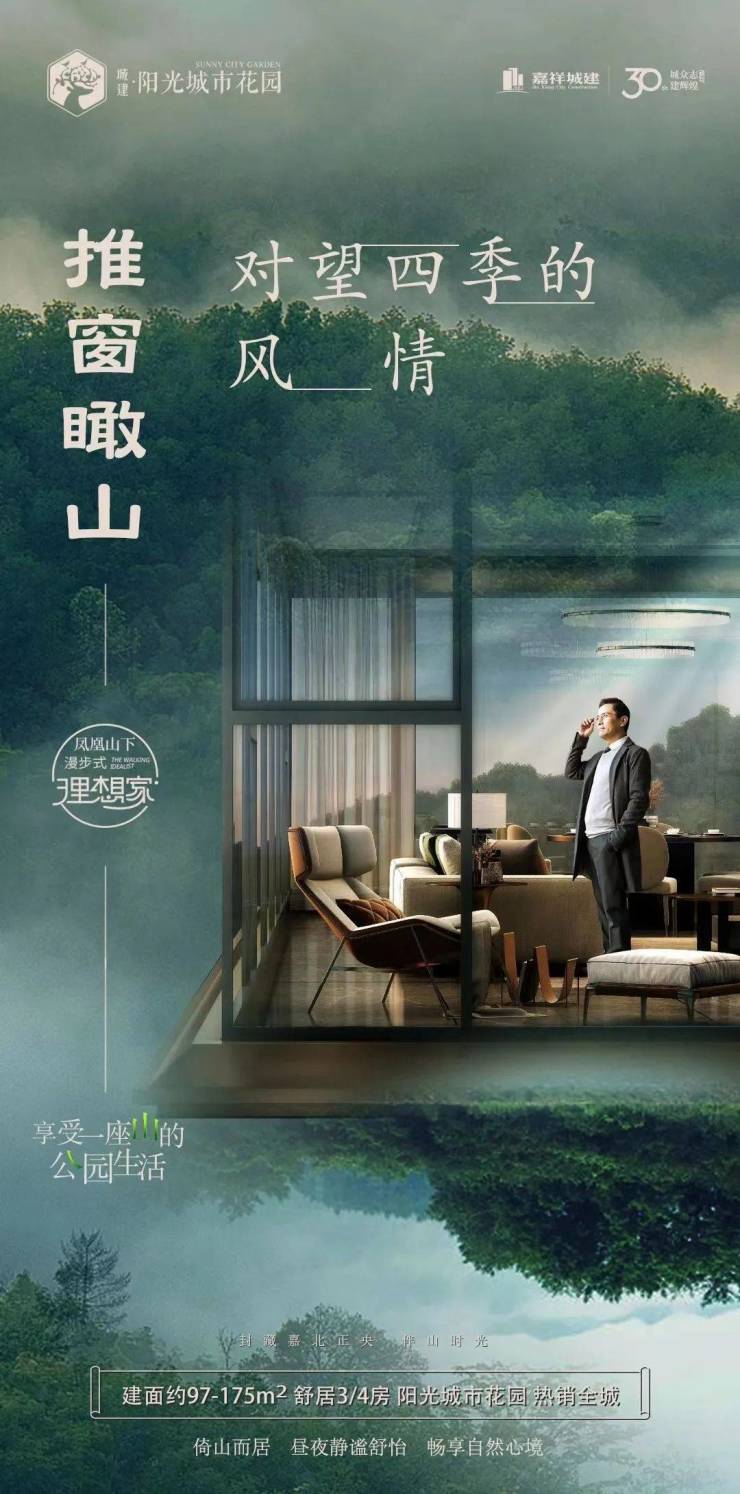 推窗瞰山,对望四季的风情。阳光城市花园享受一座山的公园生活。建面约97-175㎡舒居3/4房,阳光城市花园,热销全城。