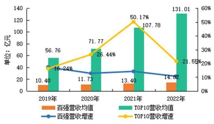从经营绩效看,2022年,百强企业营业收入均值达14.82亿元,同比增长10.62%,较上年下降3.59个百分点。头部企业凭借自身规模效应和优质资源禀赋发展多元业务、布局细分赛道,营业收入保持稳定增长。TOP10企业2022年营业收入均值达131.01亿元,同比增速为22.24%,显著下降,但仍是百强企业的近2倍,头部效应显著。