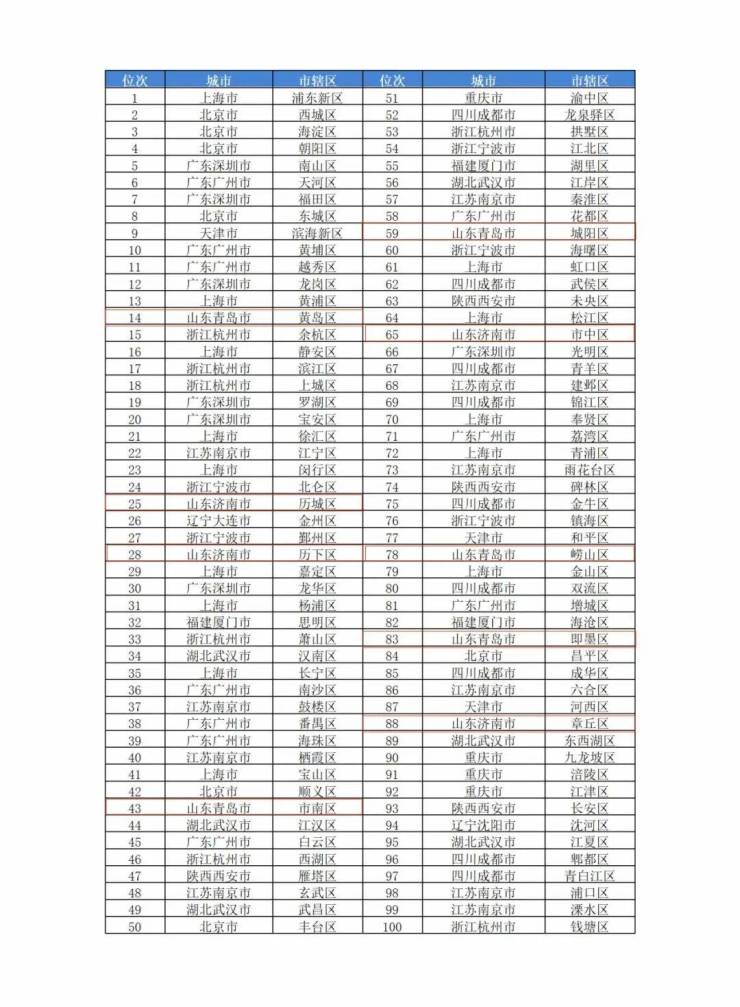 2023市辖区高质量发展百强榜,山东有17地入选,分别是青岛市黄岛区、济南市历城区、济南市历下区、青岛市市南区、青岛市城阳区、济南市市中区、青岛市崂山区、青岛市即墨区、济南市章丘区(直辖市和副省级城市市辖区榜),临沂市兰山区、烟台市芝罘区、淄博市临淄区、淄博市张店区、日照市岚山区、济宁市兖州区、济宁市任城区、聊城市茌平区(地级城市市辖区榜)。