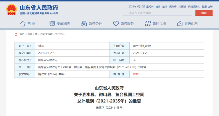 搜狐网济宁小编了解到:2024年3月29日,泗水县、微山县、鱼台县国土空间总体规划(2021-2035年)获省政府批复。
