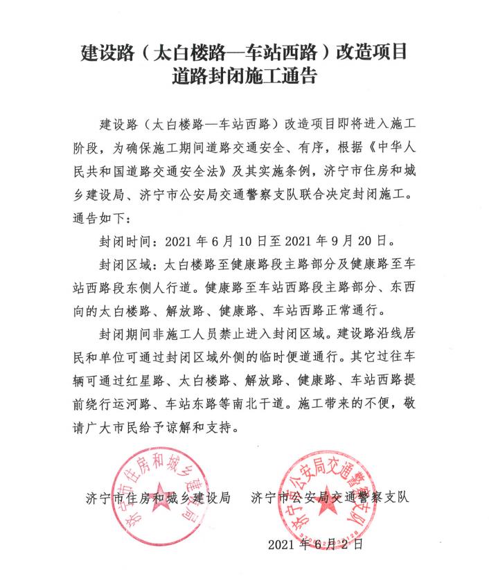建设路(太白楼路—车站西路)改造项目即将进入施工阶段,为确保施工期间道路交通安全、有序,根据《中华人民共和国道路交通安全法》及其实施条例,济宁市住房和城乡建设局、济宁市公安局交通警察支队联合决定封闭施工。通告如下: