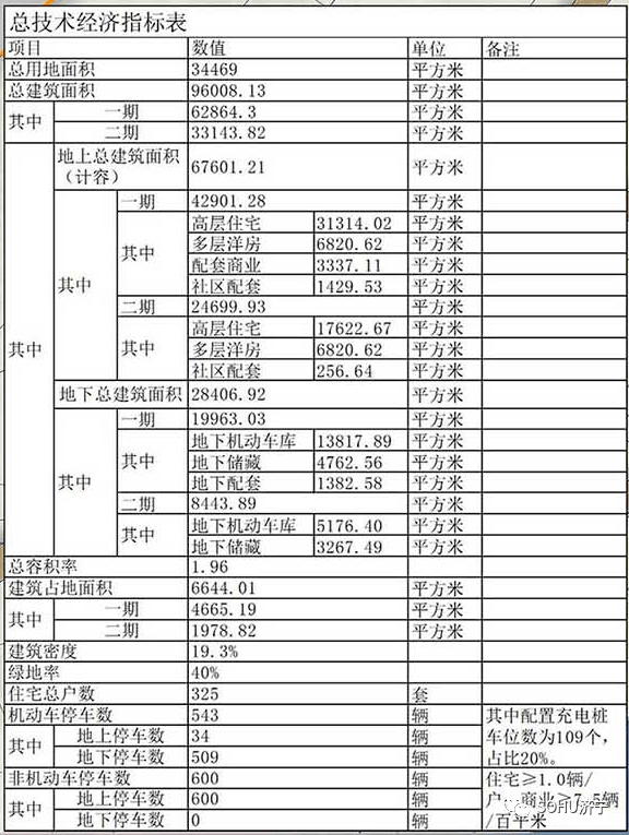 项目规划建设用地面积3.4469公顷㎡(约52亩);总建筑面积:96008.13㎡;其中地上建筑面积为67601.21㎡、地下建筑面积为28406.92㎡;容积率为1.96;建筑密度19.3%;绿地率40%;计划总居住户(套)数为325户(套),居住人数约1040人(按3.2人/户预算);建筑类型包括住宅、商业、公共配套设施等;规划机动车停车位543个,非机动车位600个。