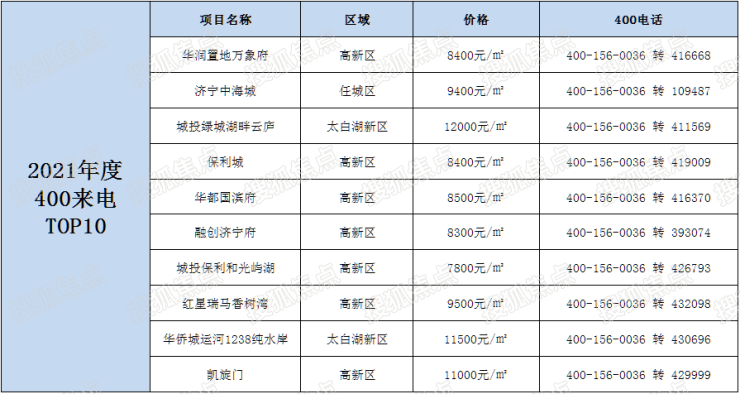 搜狐焦点济宁站2021年来电量排名前10的房地产项目分别为:华润置地万象府、济宁中海城、城投绿城湖畔云庐、保利城、华都国滨府、融创济宁府、城投保利和光屿湖、红星瑞马香树湾、华侨城运河1238纯水岸、凯旋门等。