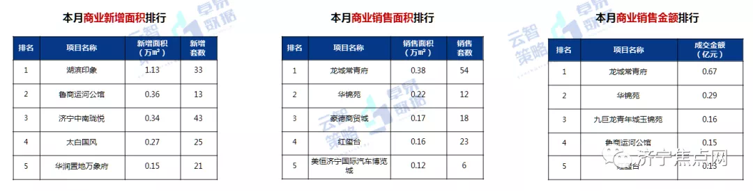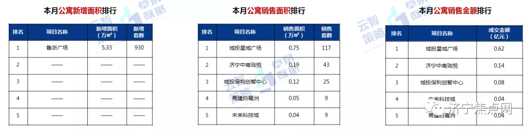 本月鲁浙广场项目以供应面积5.33万㎡位居公寓供应排行榜排名前列;从成交方面上看,城投星城广场项目以销售面积0.75万㎡,成交金额0.62亿元位居公寓销售金额,面积双排行榜排名前列。
