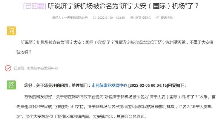 近日,搜狐网·搜狐焦点济宁小编在济宁市网络问政平台上注意到有网友提问:听说济宁新机场被命名为“济宁大安(国际)机场”了?可是济宁新机场选址位于济宁兖州漕河镇,不属于大安镇驻地呀?