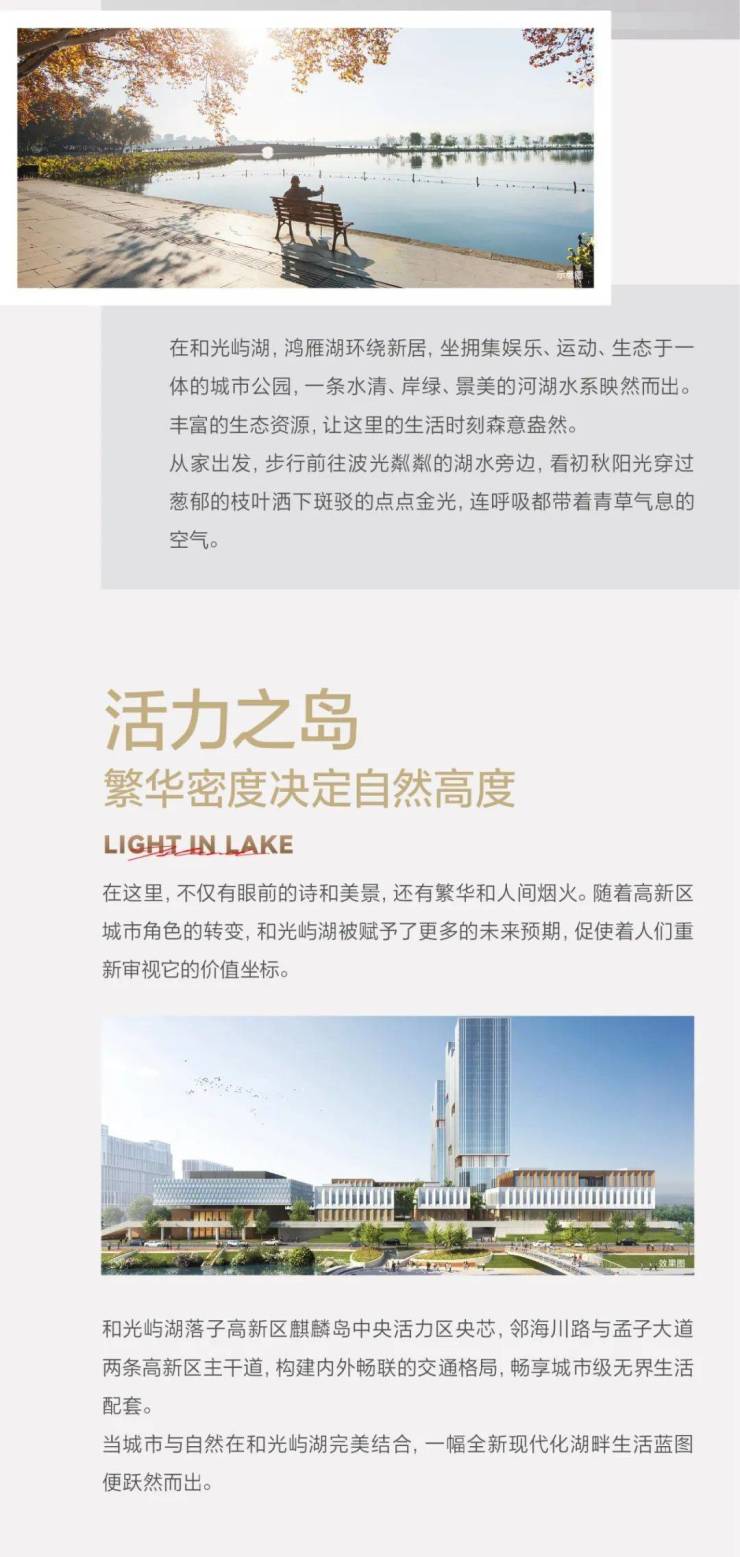 作为麒麟岛中央区首发力作,城投保利和光屿湖由保利发展、济宁创新谷、济宁城投,三大央企、国企联合匠著,集萃高新区核芯城市配套资源,鸿雁湖畔,大型商业体繁华相依,全龄优教资源环绕,极致光学产品与城市稀贵自然资源的结合,敬献