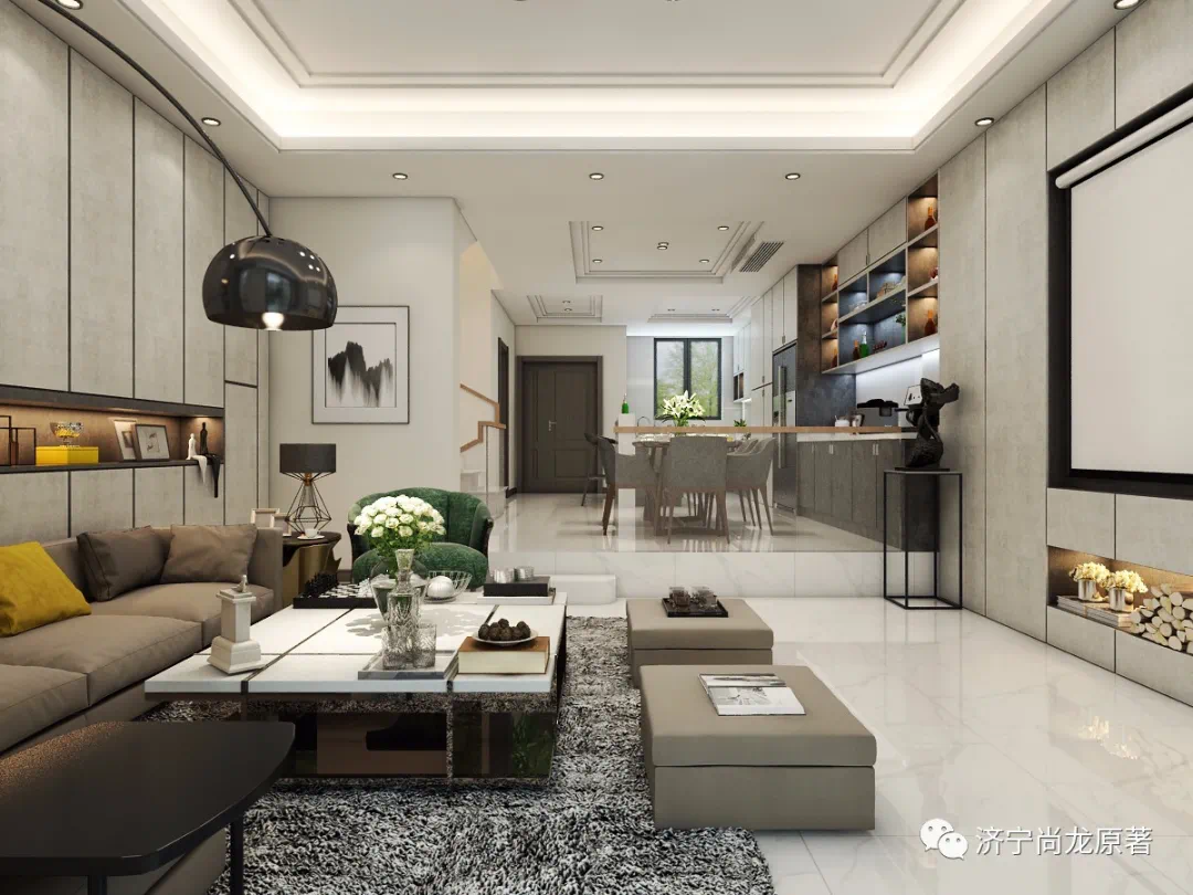 济宁尚龙原著,采用空间借用设计手法,将客厅与餐厅融为一体。通过地面、墙面的材质、色彩和纹理搭配,让宽厅更大气也更懂你所需。品牌瓷砖+品牌乳胶漆,色调柔白,增加层次感的纹理线条,当自然光在空间中迁移流转,材质呈现高级质感,让这方谈心交互的共享领地更内敛温暖。LED光源,可用多种场景模式,柔和不刺眼,身处其间,舒缓宁馨。