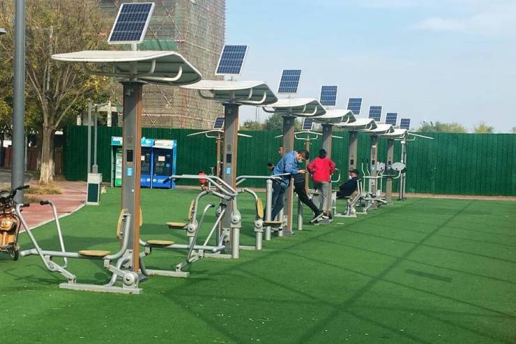 智能健身器材自带“智慧大脑”,自动语音播报,可视化教学指导,可存储运动数据。当使用者开始运动,器材上的显示屏自动亮起,实时记录健身时间、心率、消耗热量等数据。同时每套器材上都有太阳能电池板做成的遮阳板,能够遮阳避雨,及时充电,不仅颜值出众、功能齐全,而且老中青都会玩。为方便美食街区酒店住客,集团又在广场东南角增设健身器材,全方位打造了美食圈的新型“健身圈”,让群众在尽享美食的同时“练”出幸福感。