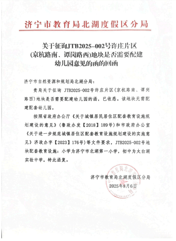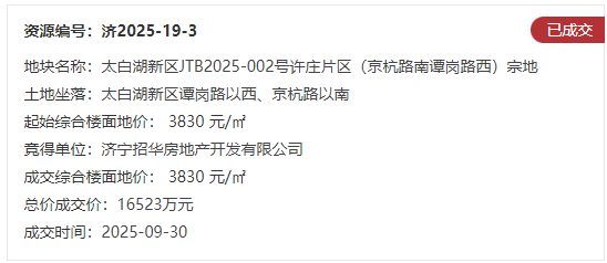 地块三:太白湖新区JTB2025-002号许庄片区(京杭路南谭岗路西)宗地【济宁招华房地产开发有限公司竞得】