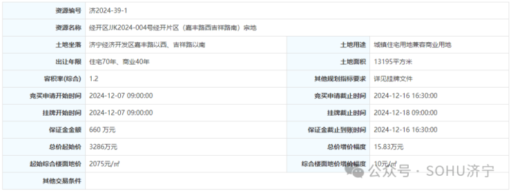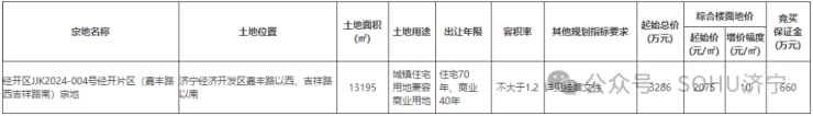 土地位于:济宁经济开发区嘉丰路以西、吉祥路以南;土地面积:13195㎡(约19.8亩);土地用途:城镇住宅用地兼容商业用地;出让年限:住宅70年、商业40年;容积率不大于1.2;起始价:3286万元,综合楼面价起价:2075元/㎡;