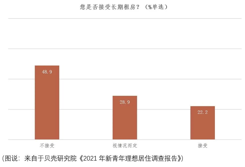 在中国人的传统观念里,“房子”与“家”密不可分,房子是家重要的构成部分。对于新青年来说,自己的房子是安全感与精神寄托的理想载体。根据贝壳研究院较新发布的《2021年新青年理想居住调查报告》调研结果显示,约48.9%的新青年受访者表示,不接受长期租房,其次约28.9%的受访者表示视情况而定。