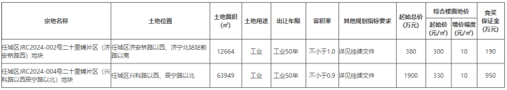 土地位于:济安桥路以西、济宁北站站前路以南;土地面积:12664㎡(约19亩);土地用途:工业用地;出让年限:50年;容积率不小于1.0;起始价:380万元,综合楼面价起价:300元/㎡;