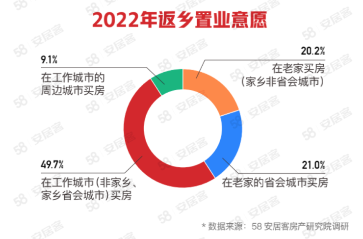 1月20日,58同城、安居客发布的《2021-2022返乡置业报告》显示,调研人群中四成计划回家乡买房,其中约60%计划买三居室。选择在工作城市置业的人群占比近半,为49.7%。