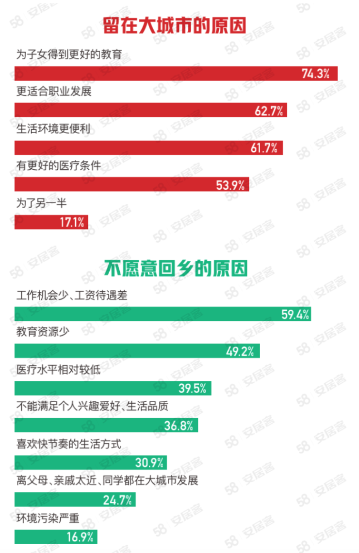 报告显示,新一线城市中,重庆、成都、西安、苏州的返乡置业热度依然先进;从2022年返乡意向来看,今年选择回乡的人群主要理由是人才、落户等优惠政策的吸引,占比从去年的27.0%上涨至56.3%;而留在大城市奋斗的人群中,子女教育成为他们坚持的重要理由,选择此项的人群占比74.3%。