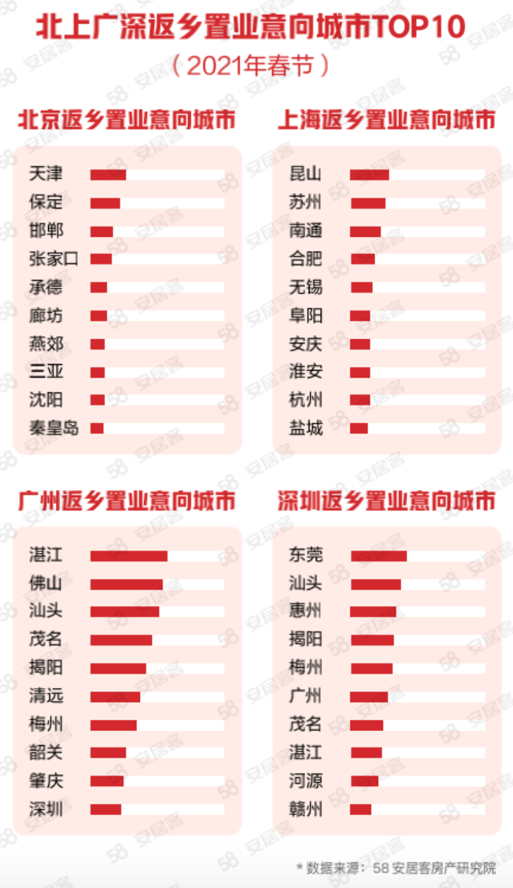 根据58安居客房产研究院统计显示,2021年春节,北京热门返乡置业意向城市为天津、保定、邯郸、张家口;上海热门返乡置业意向城市为昆山、苏州、南通、合肥;广州为湛江、佛山、汕头、茂名;深圳为东莞、汕头、惠州、揭阳等城市。