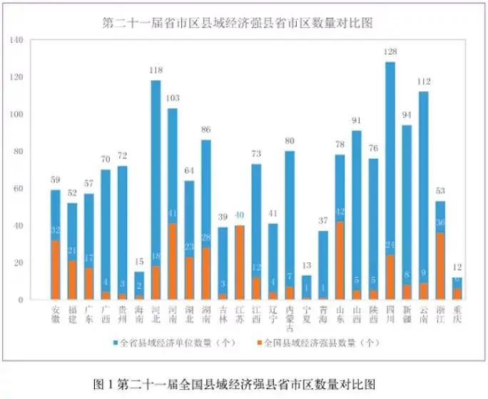 《报告》显示,第二十一届全国县域经济单位总数为1865个,其中全国县域经济强县(指地区生产总值超过300亿元的或地方公共财政收入超过20亿元的县域经济单位)共有392个。