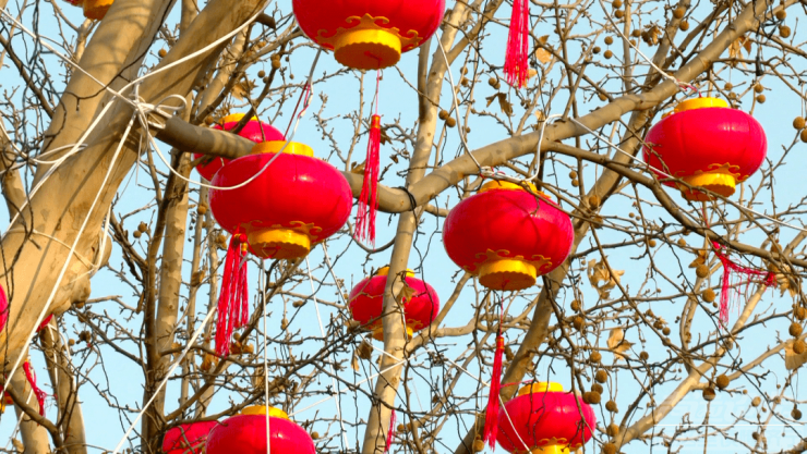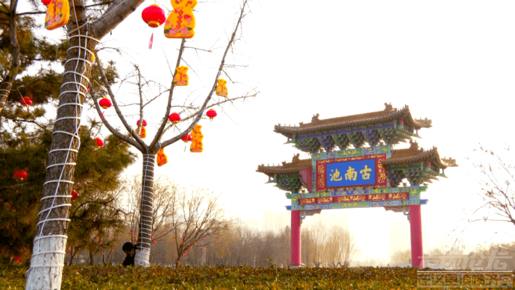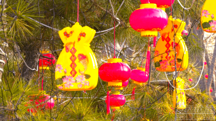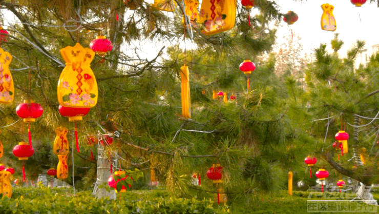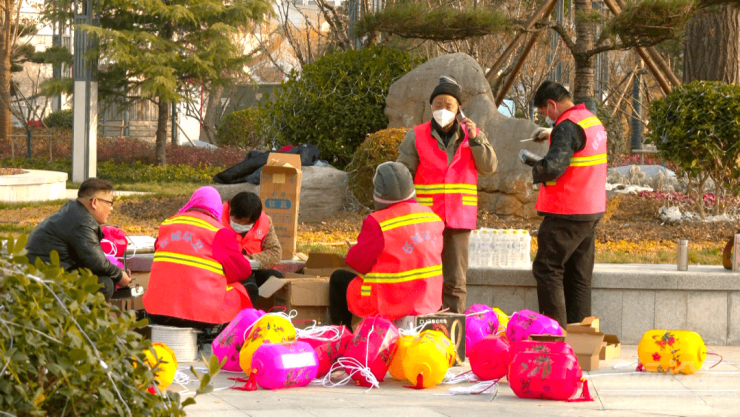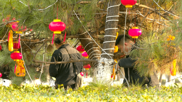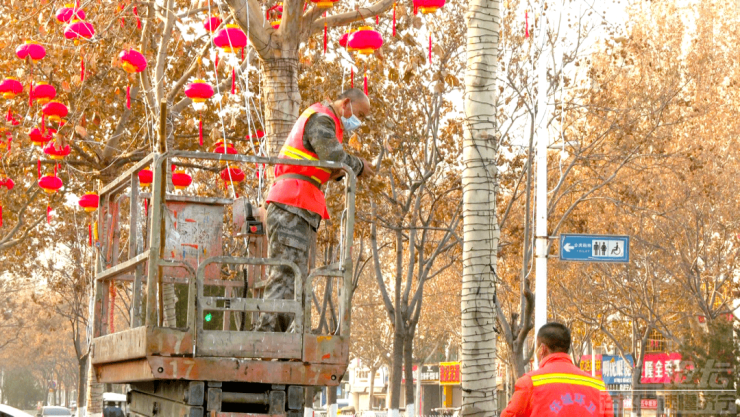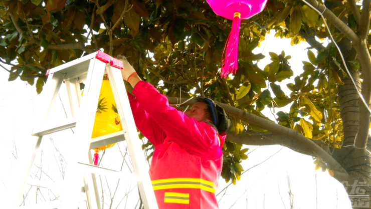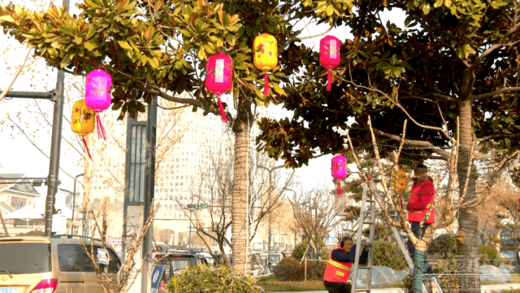 在南池公园内,施工人员正在向绿化树木上悬挂灯笼,安装春节亮化设施。一串串喜庆的大红灯笼点缀在枝头,为城区增添了浓厚的节庆氛围。