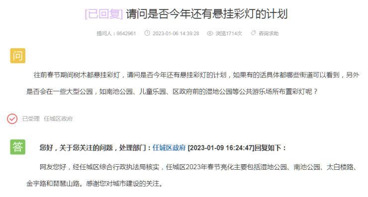 对此,任城区政府回复称,经任城区综合行政执法局核实,任城区2023年春节亮化主要包括湿地公园、南池公园、太白楼路、金宇路和琵琶山路。